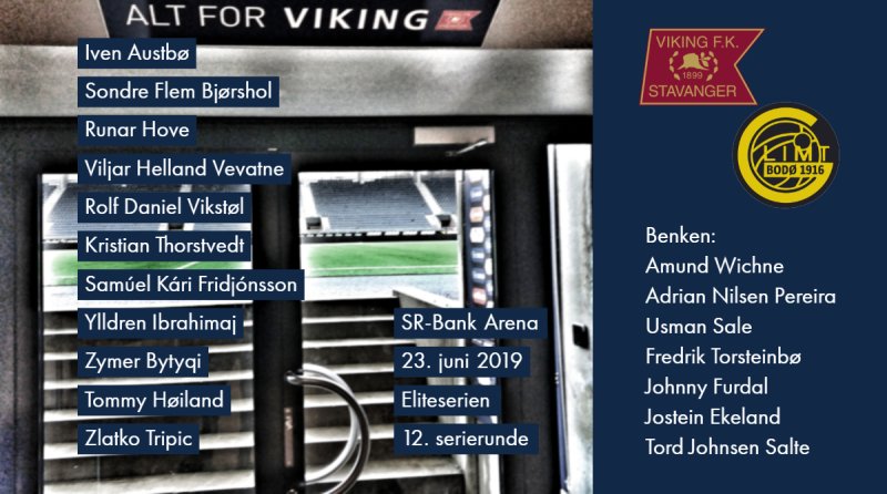 Viking: Iven Austbø – Sondre Flem Bjørshol, Runar Hove, Viljar Helland Vevatne, Rolf Daniel Vikstøl – Kristian Thorstvedt, Samúel Kári Fridjónsson, Ylldren Ibrahimaj – Zymer Bytyqi, Tommy Høiland ( Jostein Ekeland fra 76.), Zlatko Tripic (K) (Usman Sale fra 21.)