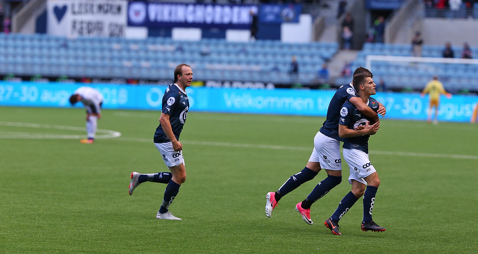 Viking - Sogndal. Ibrahimaj feirer 1-0 scoringen med Tripik, og Vikstøl kommer løpende. Foto: Tore Fjermestad