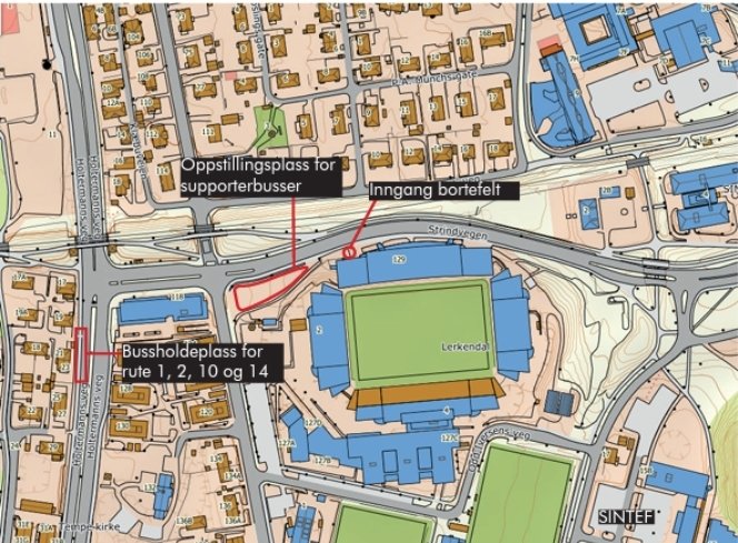 Hvordan komme seg til stadion: De fleste busser passerer Lerkendal i en eller annen grad. Bussholdeplassen nærmest stadion er Lerkendal. Metrobussen med Linse 1 og 2 er de rutene som anbefales.