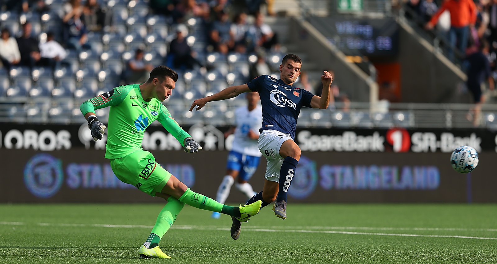 Ballen gikk mot hjørnet, men akkurat i det den var i ferd med å trille over linjen, greide Kristoffer Haugen å få satt ut en fot og stoppet skuddet. En enorm sjanse for Viking.